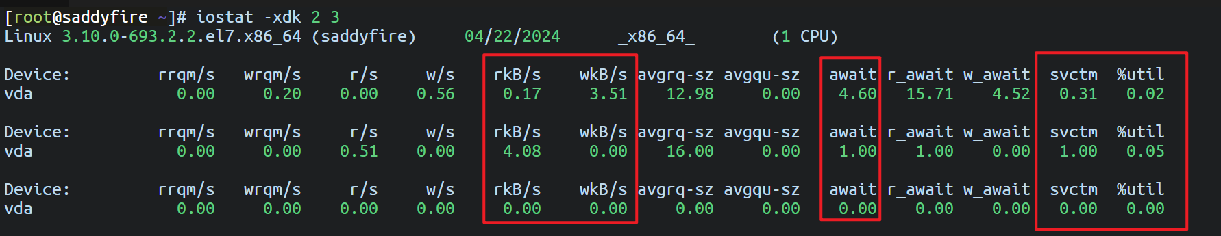 iostat -xdk 2 3(2秒钟取一次,总共取3次)