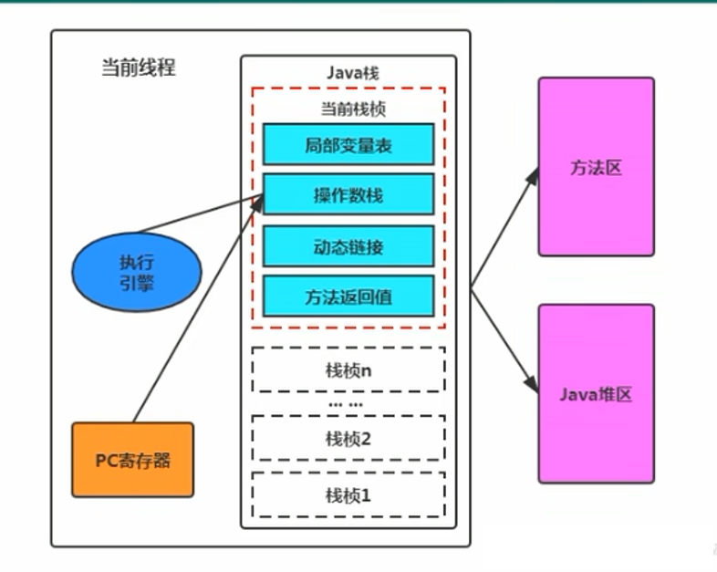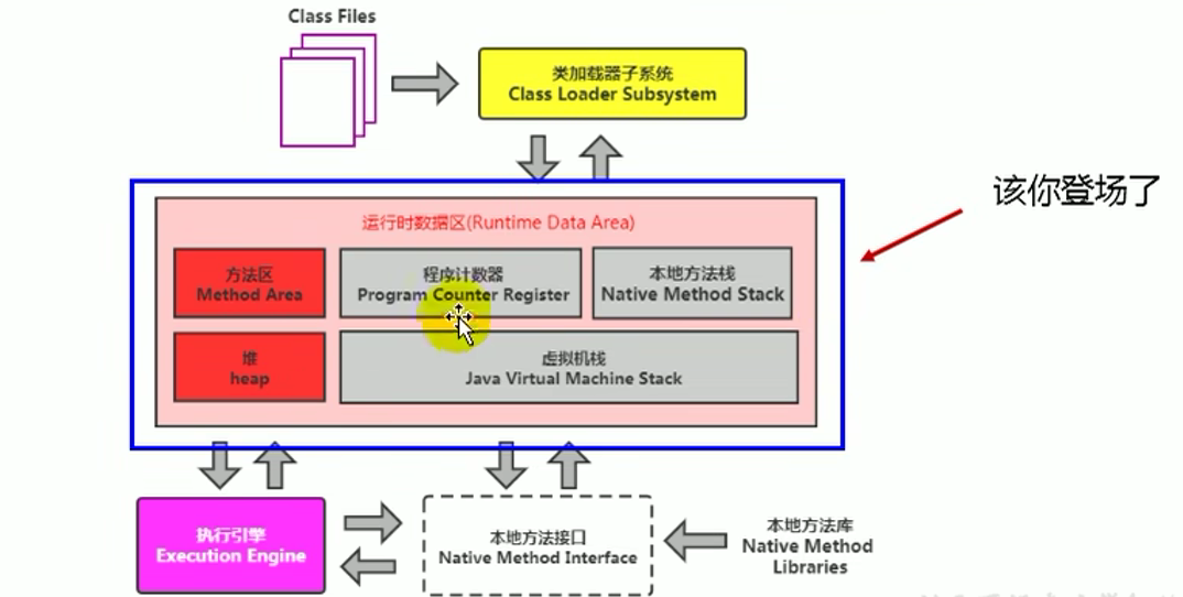 当我们通过前面的:类的加载 --> 验证 --> 准备 --> 解析 –> 初始化,这几个阶段完成后,就会用到执行引擎对我们的类进行使用,同时执行引擎将会使用到我们运行时数据区