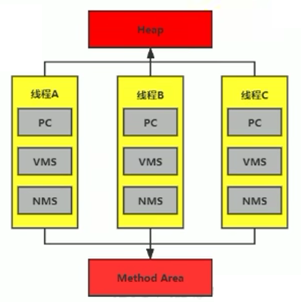 灰色的为单独线程私有的,红色的为多个线程共享的。即: