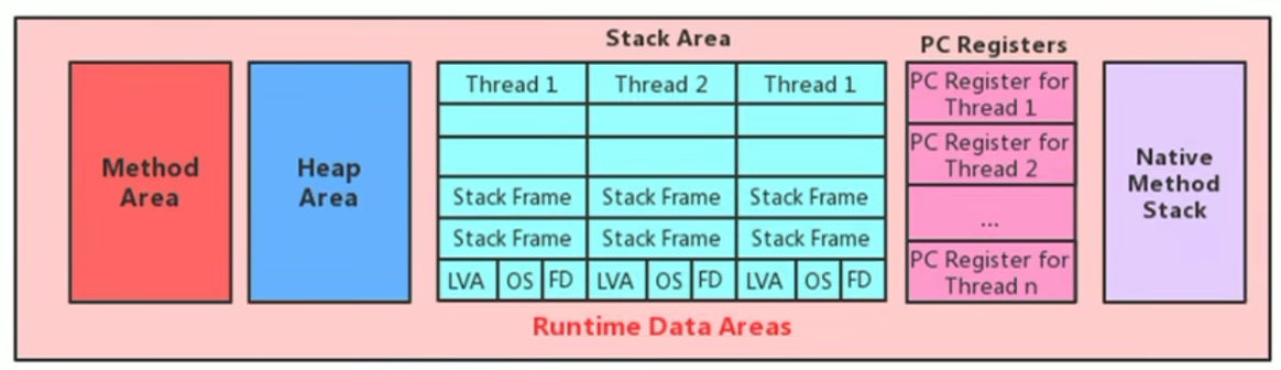 Java 虚拟机定义了若干种程序运行期间会使用到的运行时数据区:其中有一些会随着虚拟机启动而创建,随着虚拟机退出而销毁。另外一些则是与线程一一对应的,这些与线程对应的数据区域会随着线程开始和结束而创建和销毁。