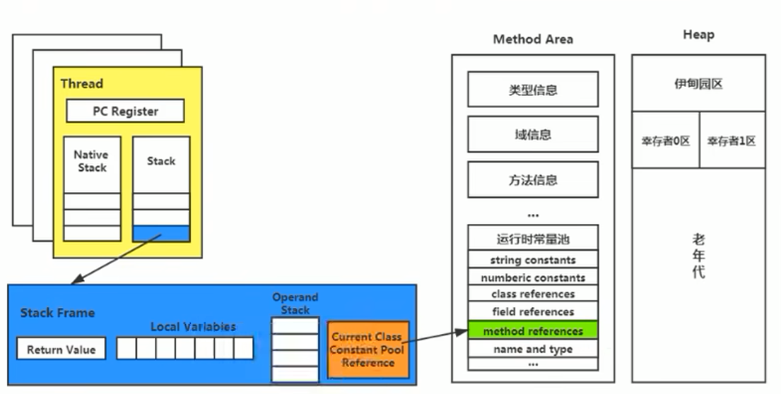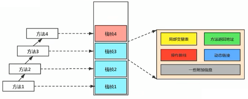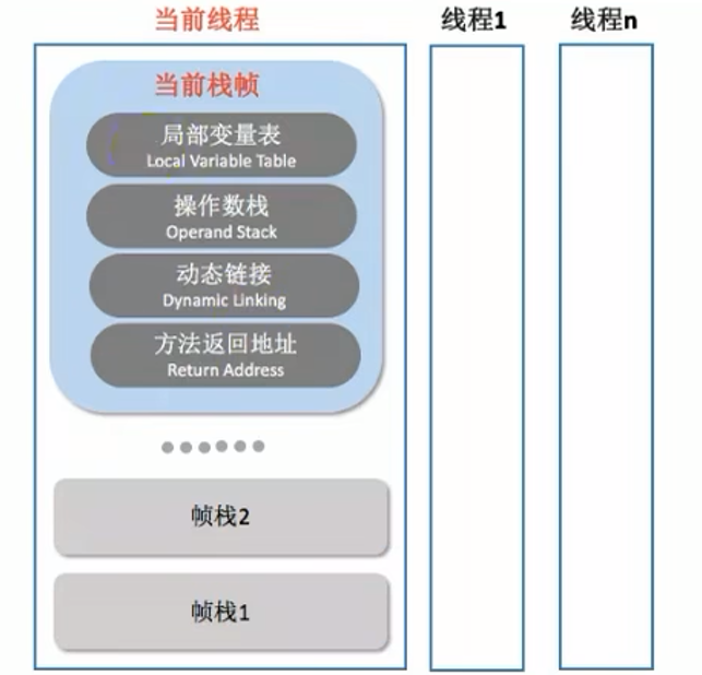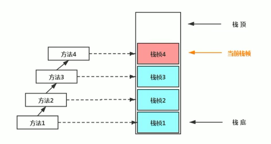 如果在该方法中调用了其他方法,对应的新的栈帧会被创建出来,放在栈的顶端,成为新的当前帧。