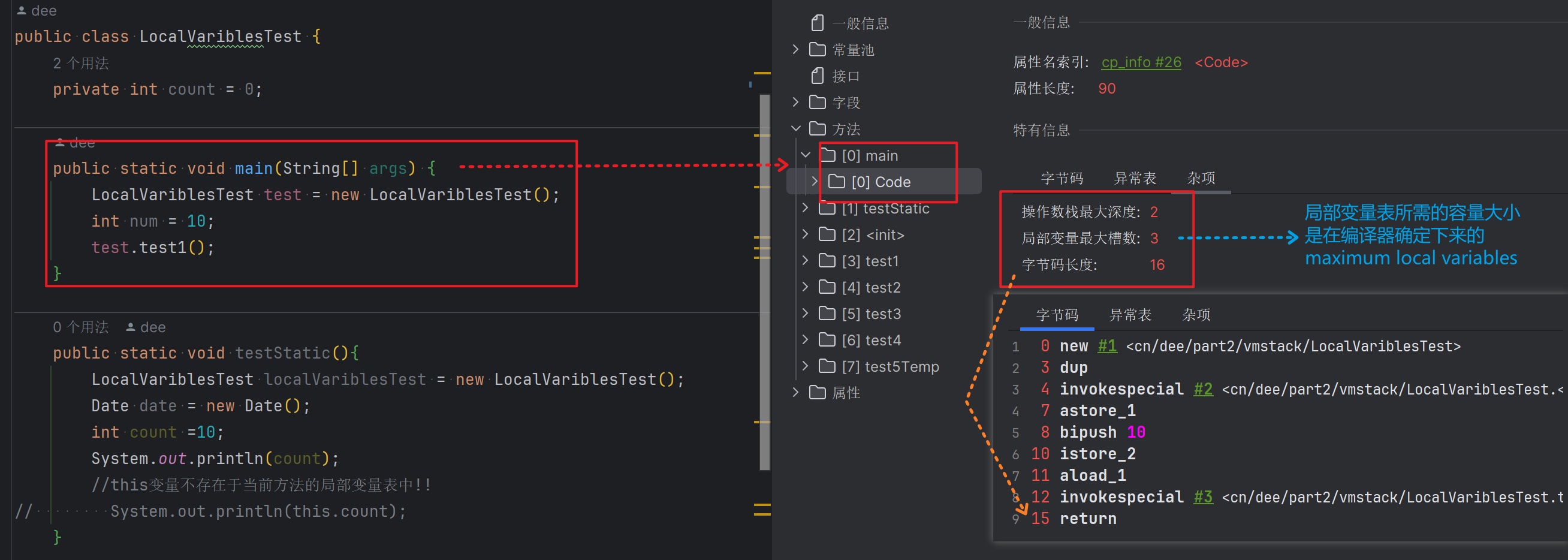 **局部变量表中的变量只在当前方法调用中有效。**在方法执行时,虚拟机通过使用局部变量表完成参数值到参数变量列表的传递过程。当方法调用结束后,随着方法栈帧的销毁,局部变量表也会随之销毁。