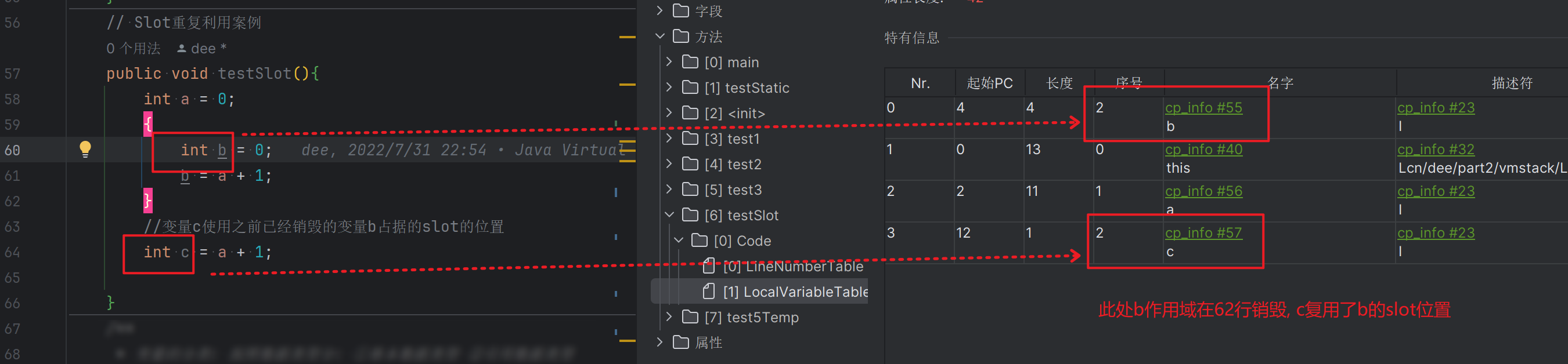 栈帧中的局部变量表中的槽位是可以重用的,如果一个局部变量过了其作用域,那么在其作用域之后申明新的局部变量变就很有可能会复用过期局部变量的槽位,从而达到节省资源的目的