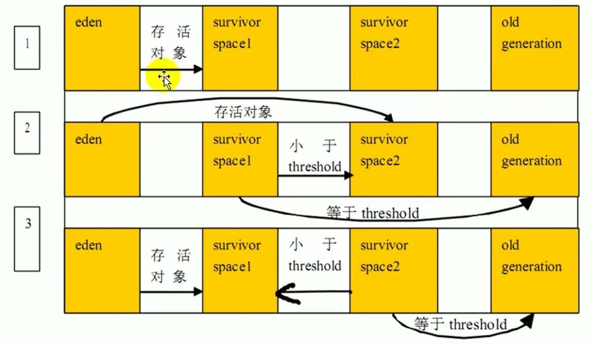 年轻代是对象的诞生、成长、消亡的区域,一个对象在这里产生、应用,最后被垃圾回收器收集、结束生命