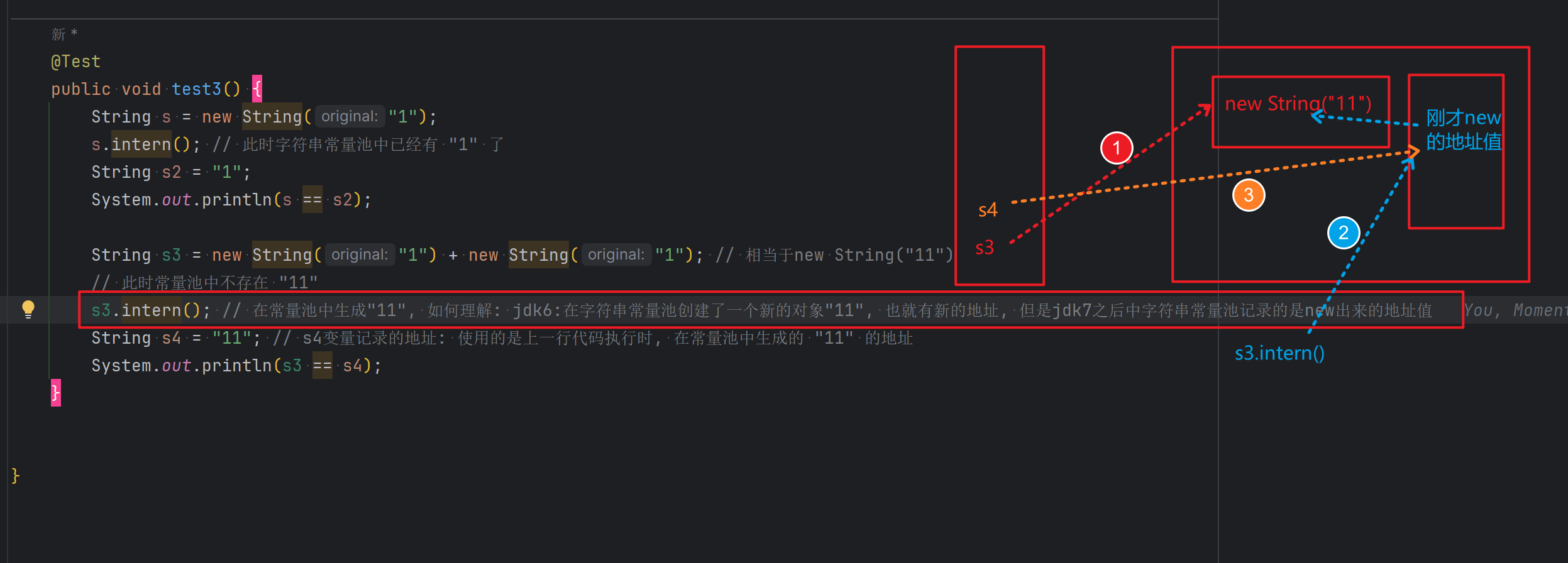 s3.intern(); // 在常量池中生成"11", 如何理解: jdk6:在字符串常量池创建了一个新的对象"11", 也就有新的地址, 但是jdk7之后中字符串常量池记录的是new出来的地址值, 并没有创建"11"