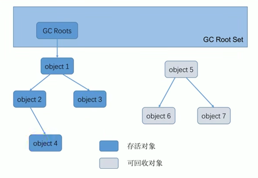- 在可达性分析算法中,只有能够被根对象集合直接或者间接连接的对象才是存活对象。