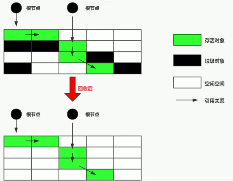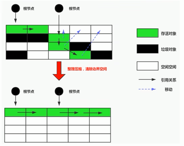 可以看到,标记的存活对象将会被整理,按照内存地址依次排列,而未被标记的内存会被清理掉。如此一来,当我们需要给新对象分配内存时,JVM 只需要持有一个内存的起始地址即可,这比维护一个空闲列表显然少了许多开销。