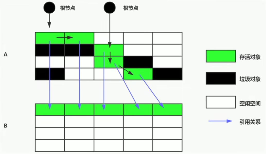 将活着的内存空间分为两块,每次只使用其中一块,在垃圾回收时将正在使用的内存中的存活对象复制到未被使用的内存块中,之后清除正在使用的内存块中的所有对象,交换两个内存的角色,最后完成垃圾回收