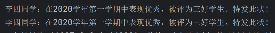 System.out.println(name + "同学:在2020学年第一学期中表现优秀,被评为三好学生。特发此状!");
